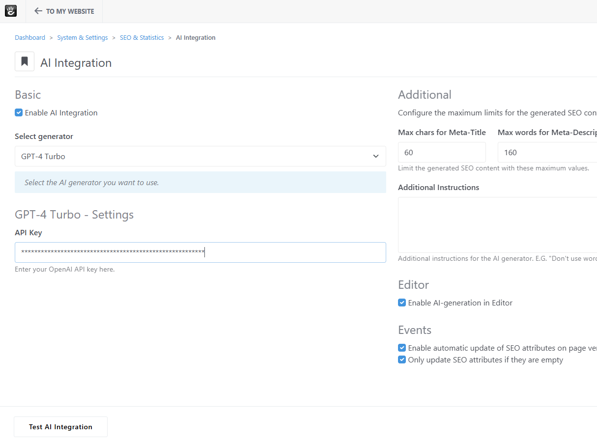 - Access this via Dashboard > System > SEO > AI Integration and select GPT-4 Turbo where available.