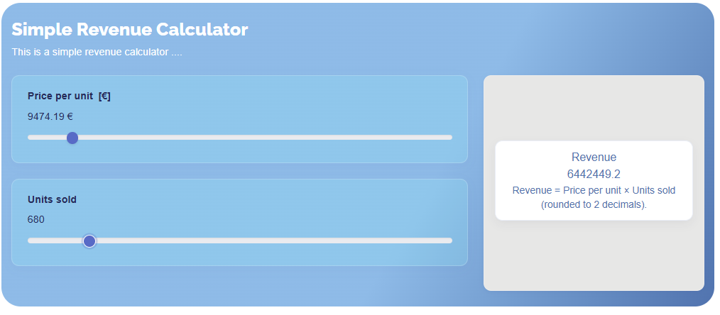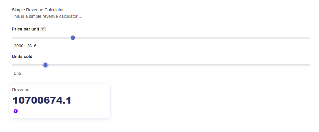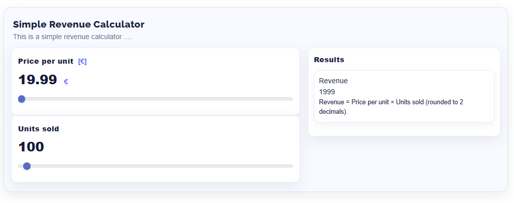 - Flexible inputs: name, unit, key, min/max/step/default; field types Input, Slider, Hidden