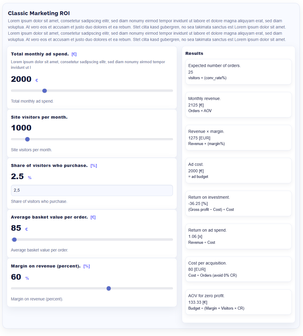 ROI Calculator for Concrete CMS: an interactive calculator block with configurable parameters, formulas, and results. Supports multiple instances per page, a clean two-column results grid, tooltips, translations, and modern templates.