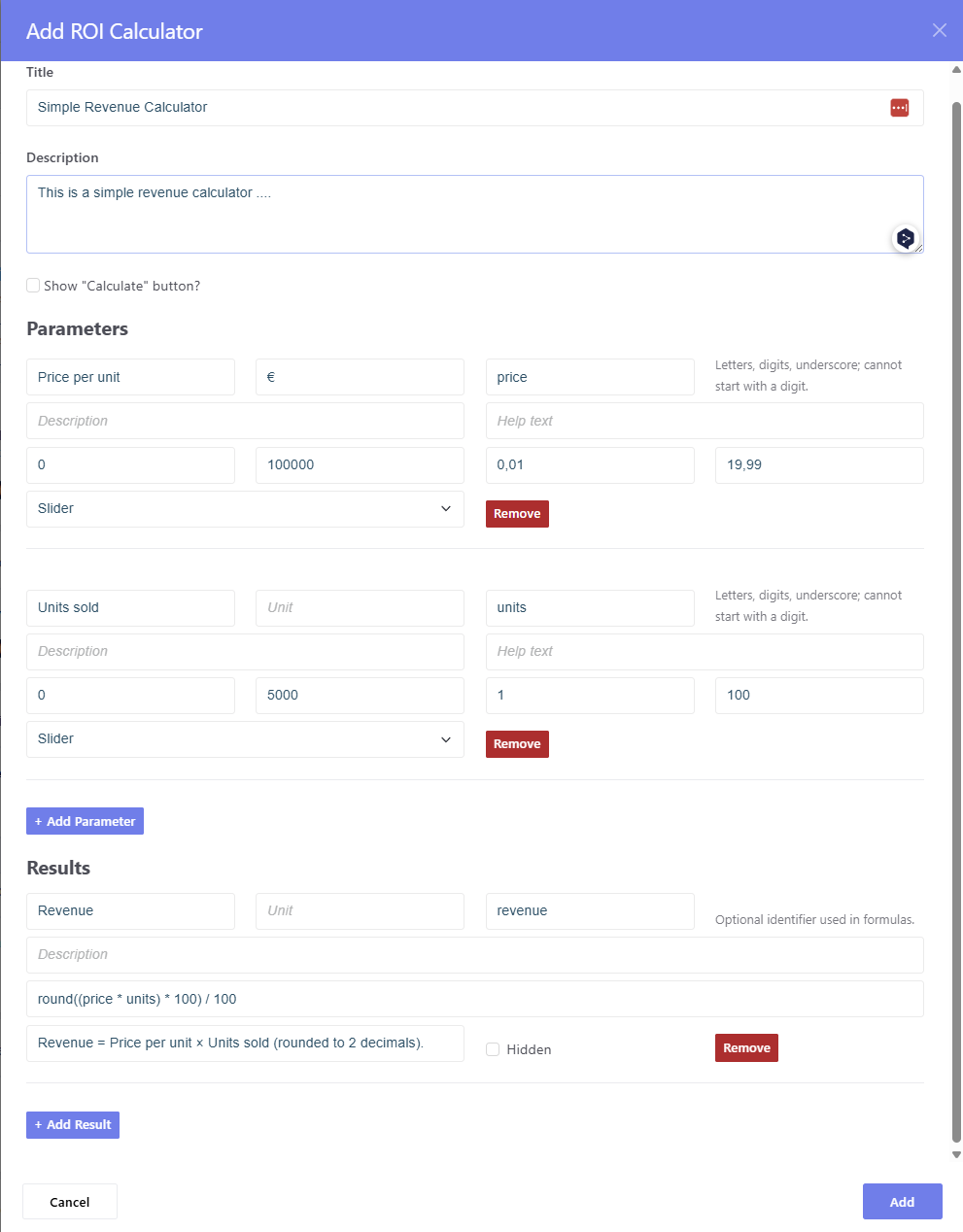 - Configure Parameters (inputs) and Results (formulas).